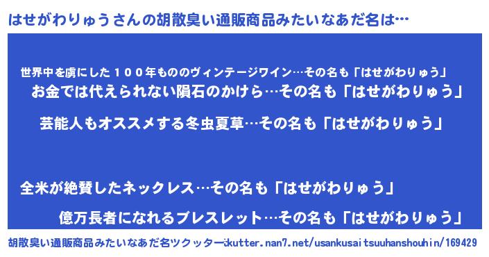| 意味不明あだ名 | 『自称はせがわりゅう』 |