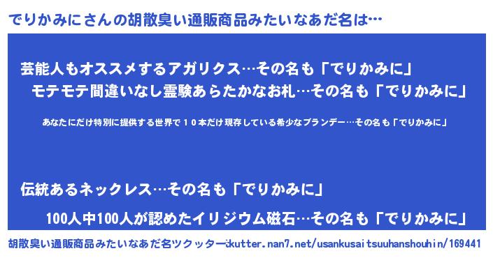 | 意味不明あだ名 | 『住所不定無職でりかみに(93歳)』 |