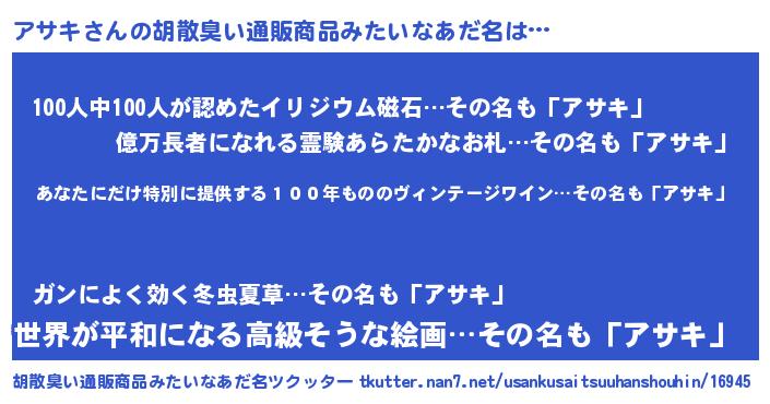 | 意味不明あだ名 | 『住所不定無職アサキ(2歳)』『自称アサキ』 |