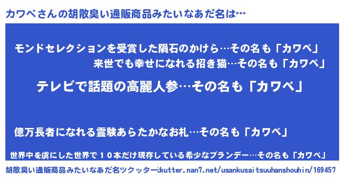 | ヒーロー風カッコイイあだ名 | 『サイバー戦士カワベ』『仮面カワダー』 |