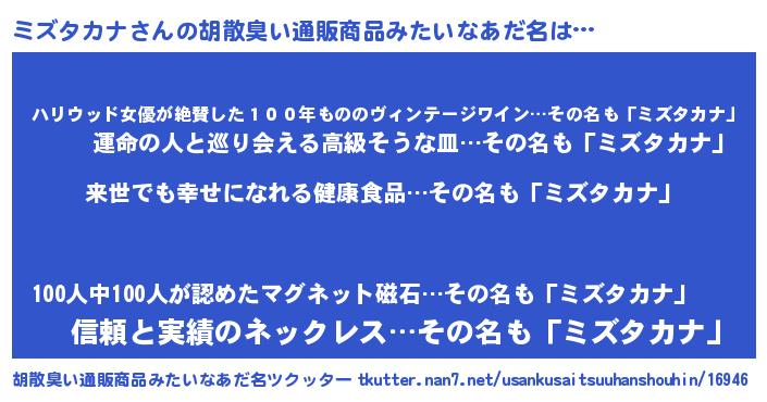 | ヘコむあだ名 | 『ミズタカナ(笑)』『ミズお』『牛乳』 |