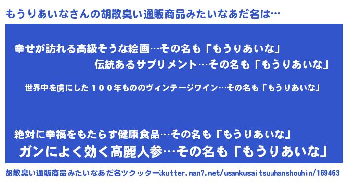 | 男性向けラノベタイトル風あだ名 | 『この素晴らしい世界にもうりあいなを!』 |