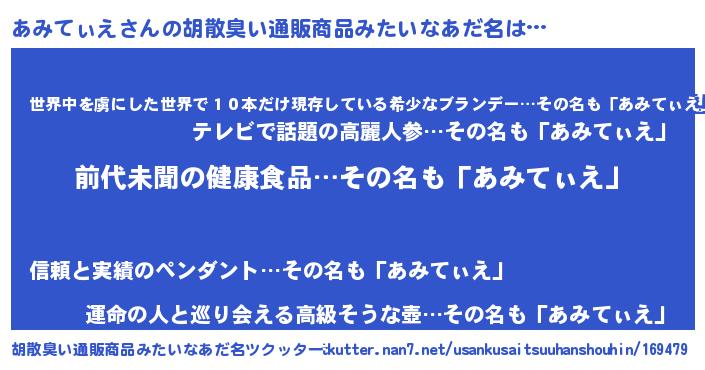 | 意味不明あだ名 | 『永久保存あみてぃえ』『自称あみてぃえ』 |