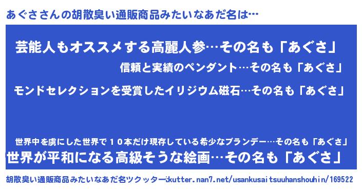 | 男性向けラノベタイトル風あだ名 | 『ノーゲーム・ノーアグサ』 |