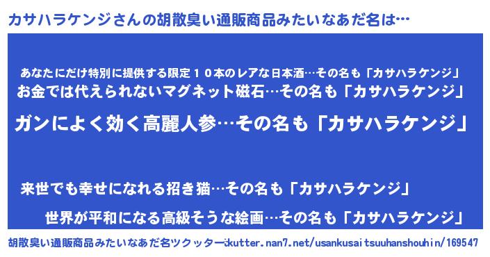 | 男性向けラノベタイトル風あだ名 | 『カサハラケンジスレイヤー』 |