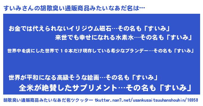 | 意味不明あだ名 | 『住所不定無職すいみ(91歳)』 |
