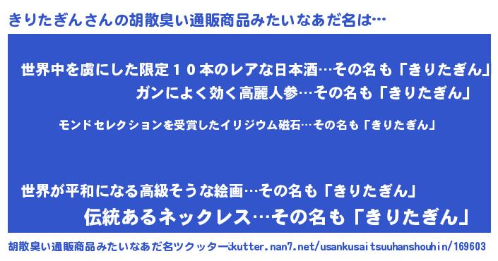 | 男性向けラノベタイトル風あだ名 | 『ノーゲーム・ノーキリタギン』 |