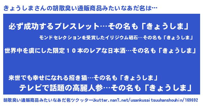 | 意味不明あだ名 | 『住所不定無職きょうしま(65歳)』 |