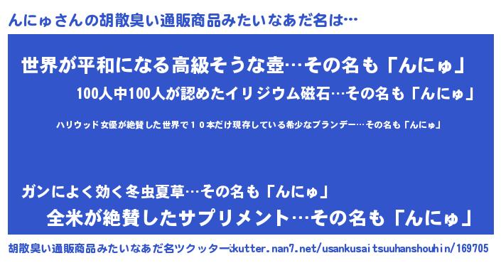 | 意味不明あだ名 | 『住所不定無職んにゅ(98歳)』 |