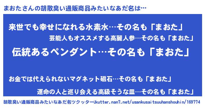 | 意味不明あだ名 | 『とにかく怪しいまおた』『自称まおた』 |
