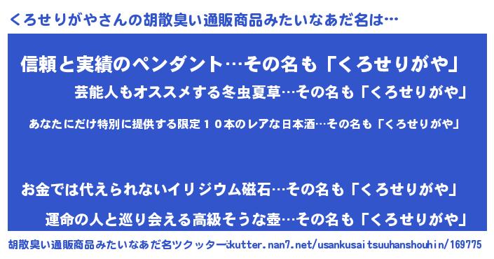 | 男性向けラノベタイトル風あだ名 | 『この素晴らしい世界にくろせりがやを!』 |