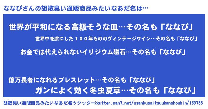 | 女子向けラノベタイトル風あだ名 | 『ななぴ恋絵巻』『ななぴの雑貨屋さん』 |
