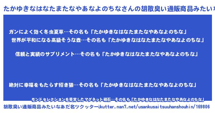 | 男性向けラノベタイトル風あだ名 | 『緋弾のタカユキナハナタマタナヤアナヨノチナ』 |