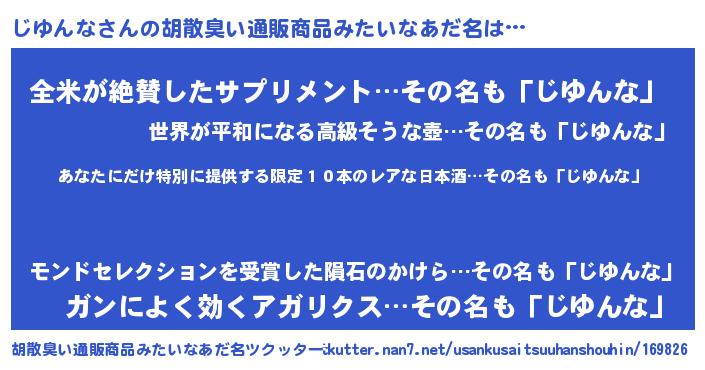 | 男性向けラノベタイトル風あだ名 | 『じゆんなに滅ぼされるだけの簡単なお仕事です』 |