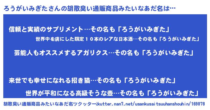 | 恥ずかしいあだ名 | 『ロウガイミギタデラックス』『ろうちん』 |