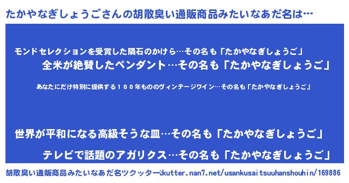 | 男性向けラノベタイトル風あだ名 | 『この素晴らしい世界にたかやなぎしょうごを!』 |