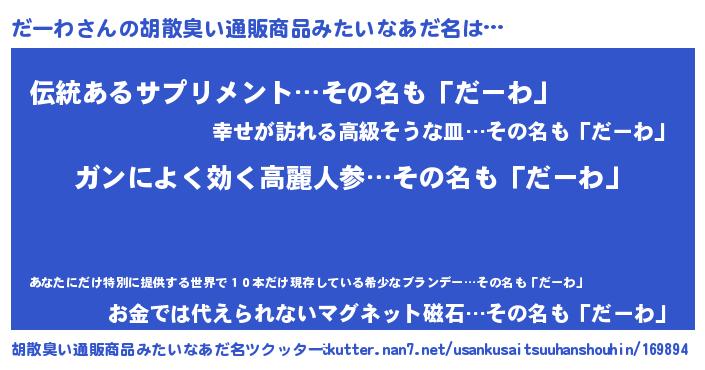 | 男性向けラノベタイトル風あだ名 | 『はたらくだーわさま!』『緋弾のダーワ』 |