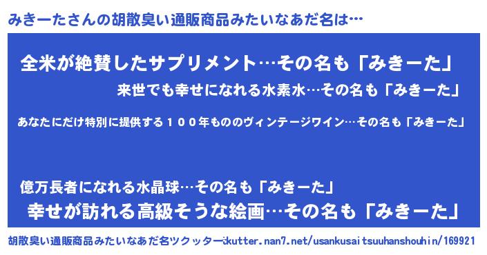 | 意味不明あだ名 | 『住所不定無職みきーた(9歳)』 |