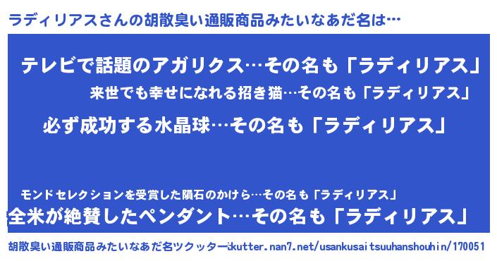 | 男性向けラノベタイトル風あだ名 | 『ラディリアスの憂鬱』 |