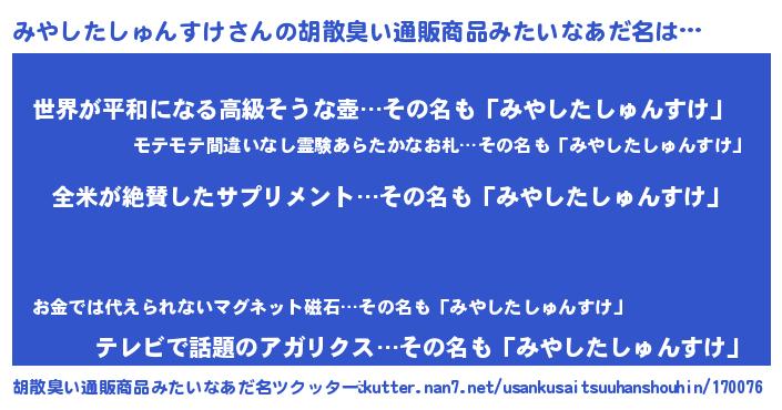 | 男性向けラノベタイトル風あだ名 | 『みやしたしゅんすけの嫁は女の子じゃないと思った?』 |