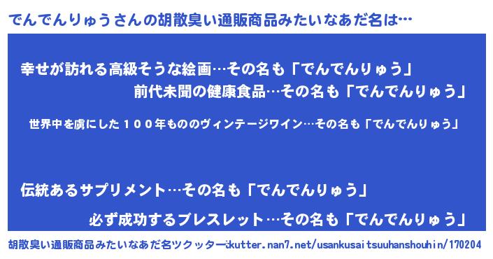 | 男性向けラノベタイトル風あだ名 | 『この素晴らしい世界にでんでんりゅうを!』 |