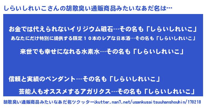 | ヘコむあだ名 | 『しらいしれいこ(遠い目)』『しらぷりん』 |