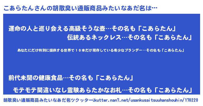 | 男性向けラノベタイトル風あだ名 | 『この素晴らしい世界にこあらたんを!』 |