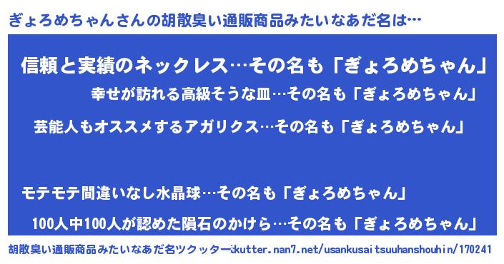 | 男性向けラノベタイトル風あだ名 | 『Re:ぎょろめちゃんから始める異世界生活』 |