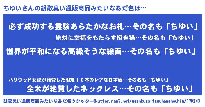 | ヘコむあだ名 | 『なまこ酢』『ちゆにー』 |