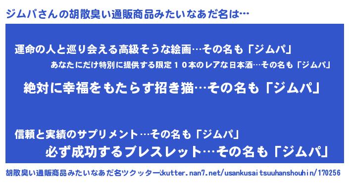 | 男性向けラノベタイトル風あだ名 | 『緋弾のジムパ』『ジムパの憂鬱』 |