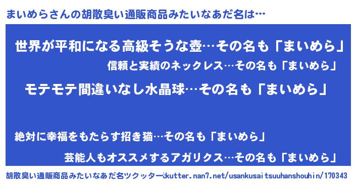 | 意味不明あだ名 | 『ペロリンまいめら』『自称まいめら』 |