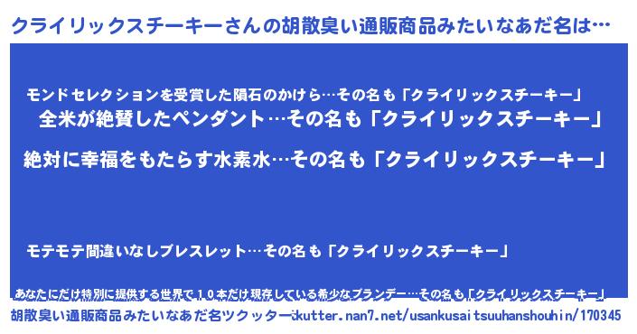 | ヘコむあだ名 | 『クライリックスチーキー(震え声)』 |
