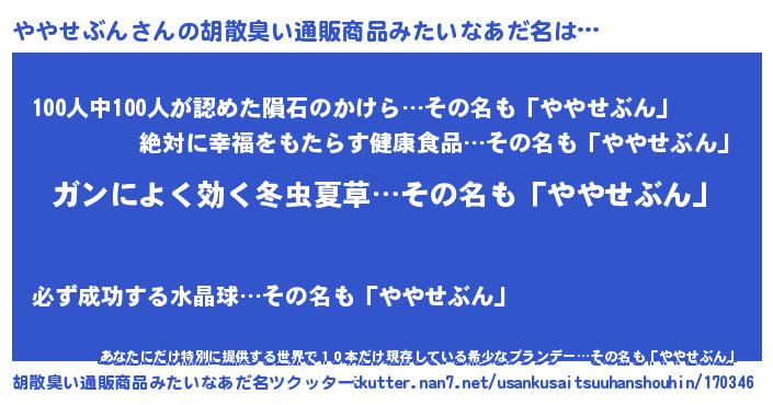 | 意味不明あだ名 | 『自称ややせぶん』『永久保存ややせぶん』 |