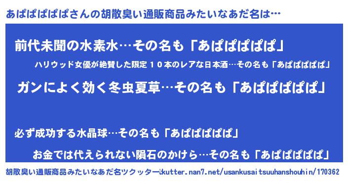 | ヘコむあだ名 | 『あぱぱぱぱぱ(遠い目)』『あぱっふぃ~』 |