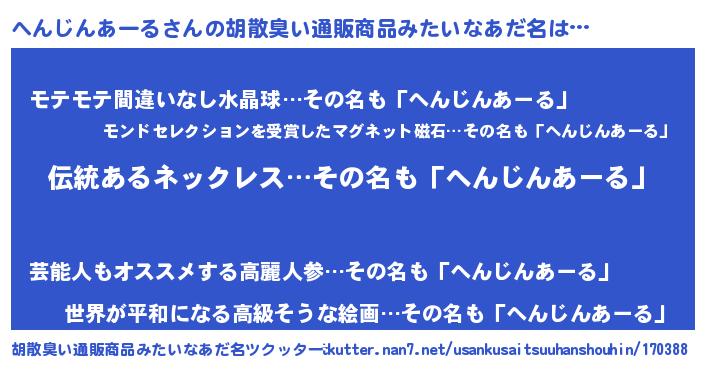 | 男性向けラノベタイトル風あだ名 | 『へんじんあーるの嫁は女の子じゃないと思った?』 |