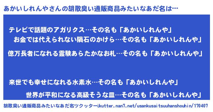 | 男性向けラノベタイトル風あだ名 | 『アカイシレンヤアートオンライン』 |