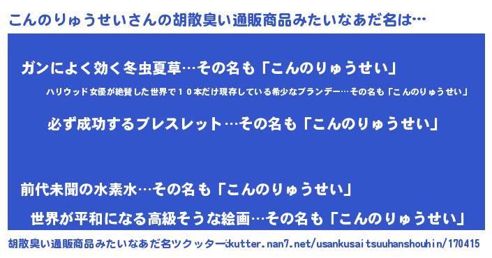 | 男性向けラノベタイトル風あだ名 | 『こんのりゅうせいの憂鬱』 |