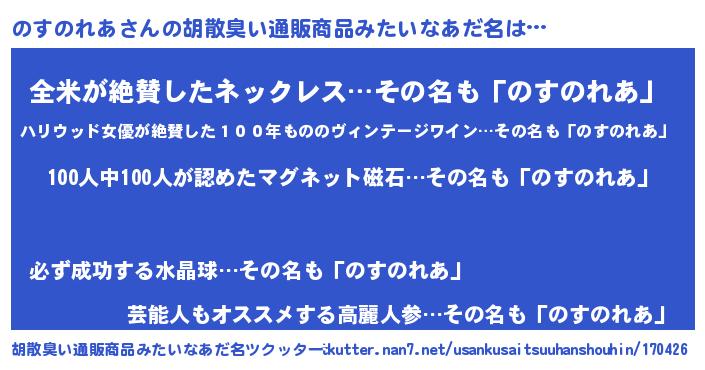 | ヘコむあだ名 | 『のす太郎』『のすもー』『酢こんぶ』 |