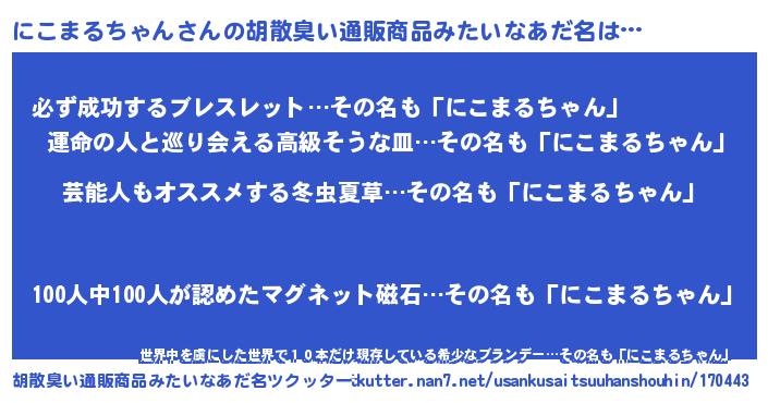 | 男性向けラノベタイトル風あだ名 | 『Re:にこまるちゃんから始める異世界生活』 |