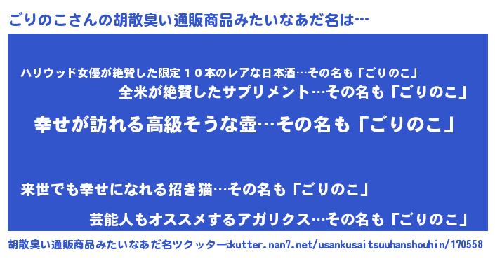 | 女子向けラノベタイトル風あだ名 | 『ごりのこの雑貨屋さん』 |