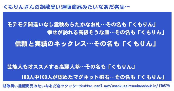 | 男性向けラノベタイトル風あだ名 | 『ダンジョンにくもりんを求めるのは間違っているだろうか』 |
