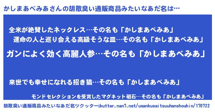 | 欧米人風あだ名 | 『ケンブリッジかしまあべみあ』 |