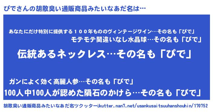 | 男性向けラノベタイトル風あだ名 | 『ぴでの嫁は女の子じゃないと思った?』 |