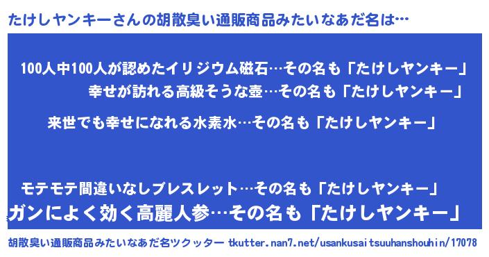 | 男性向けラノベタイトル風あだ名 | 『たけしヤンキーという概念が存在しない退屈な世界 』 |