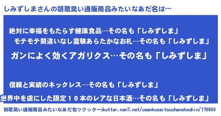 | 意味不明あだ名 | 『自称しみずしま』『永久保存しみずしま』 |