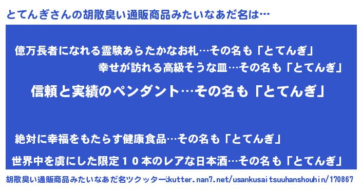 | 男性向けラノベタイトル風あだ名 | 『ダンジョンにとてんぎを求めるのは間違っているだろうか』 |
