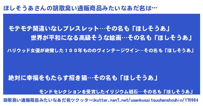 | 意味不明あだ名 | 『住所不定無職ほしそうあ(13歳)』 |