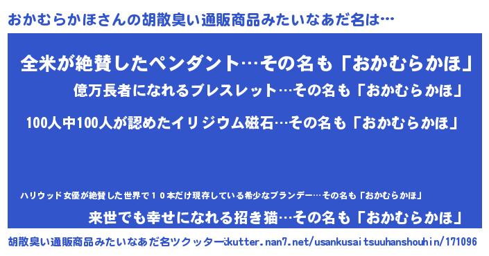 | 男性向けラノベタイトル風あだ名 | 『おまえをオタクにしてやるから、俺をおかむらかほにしてくれ! 』 |