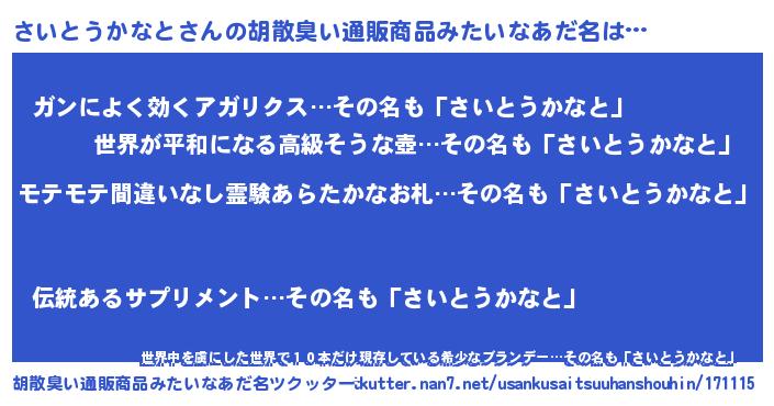 | 男性向けラノベタイトル風あだ名 | 『さいとうかなとに滅ぼされるだけの簡単なお仕事です』 |