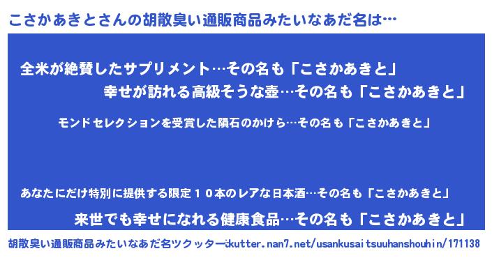 | 男性向けラノベタイトル風あだ名 | 『ノーゲーム・ノーコサカアキト』 |